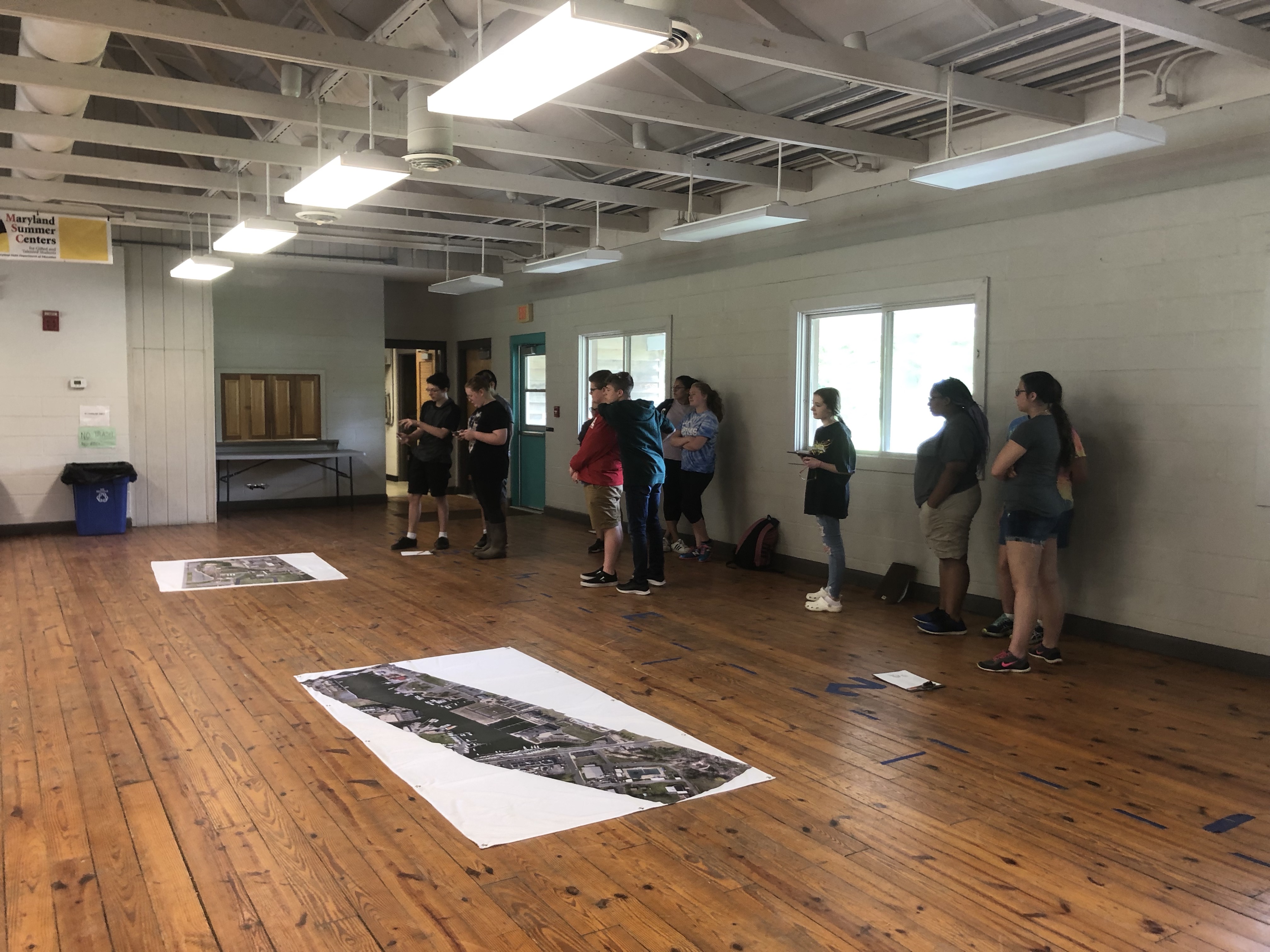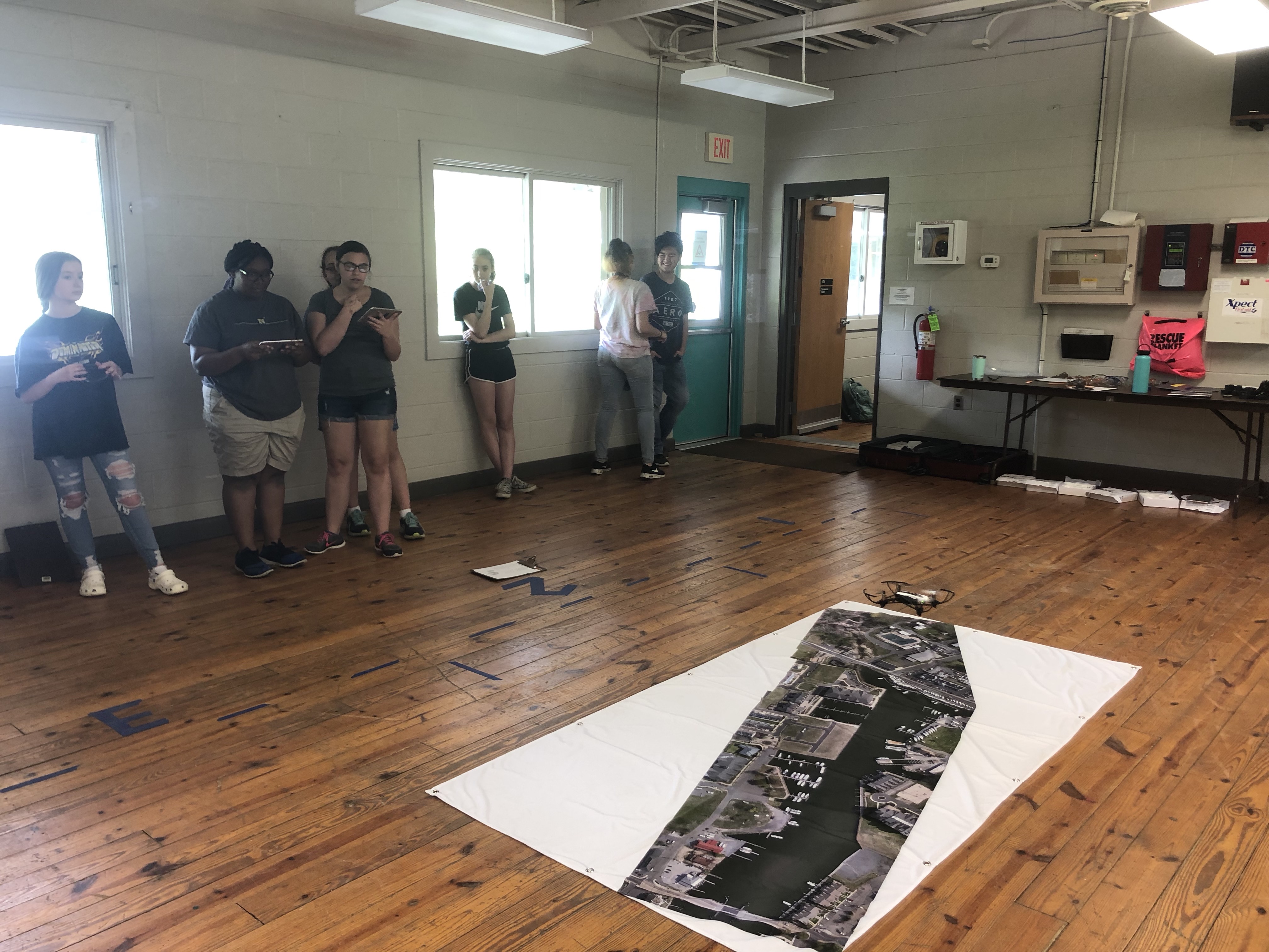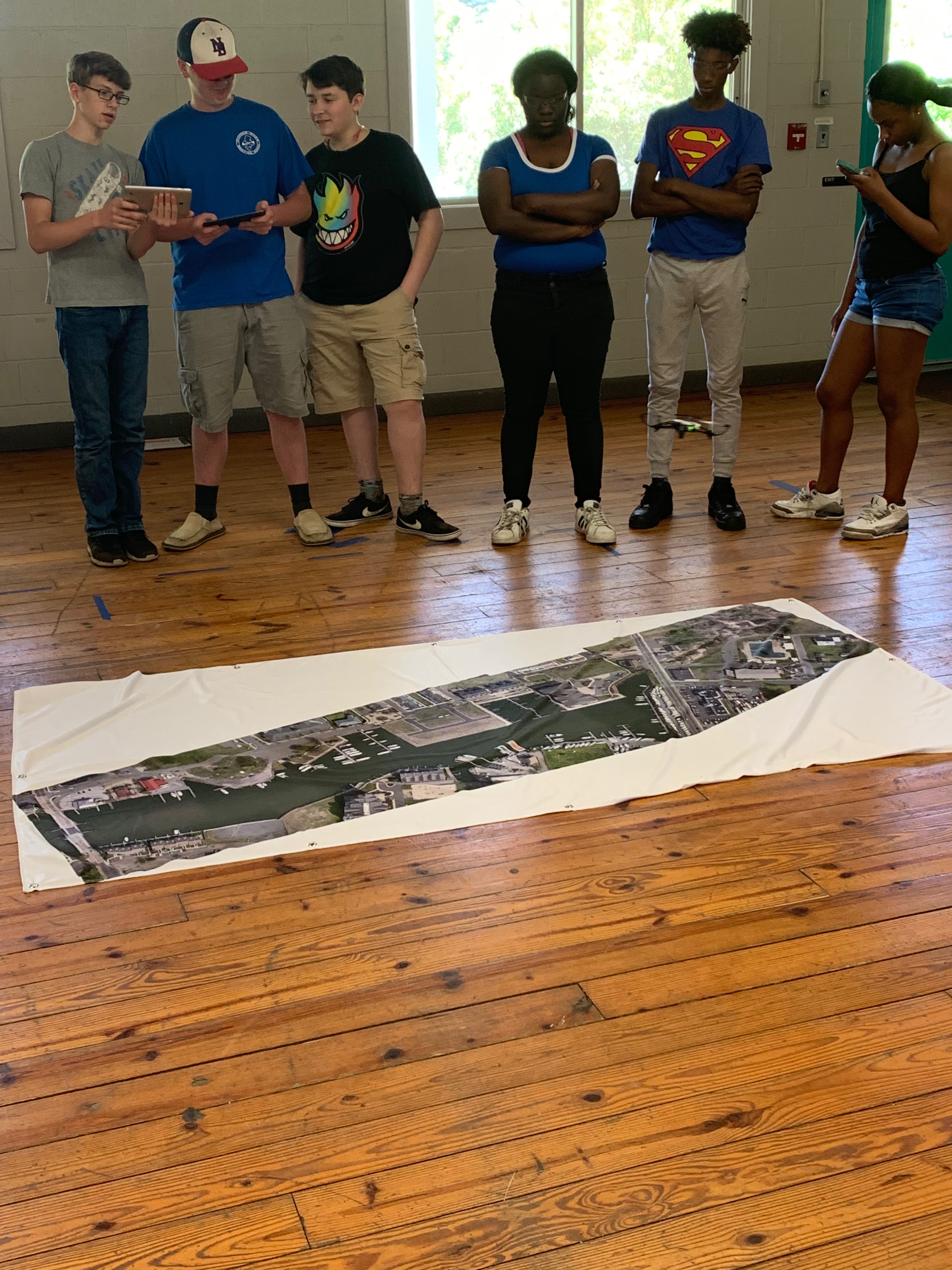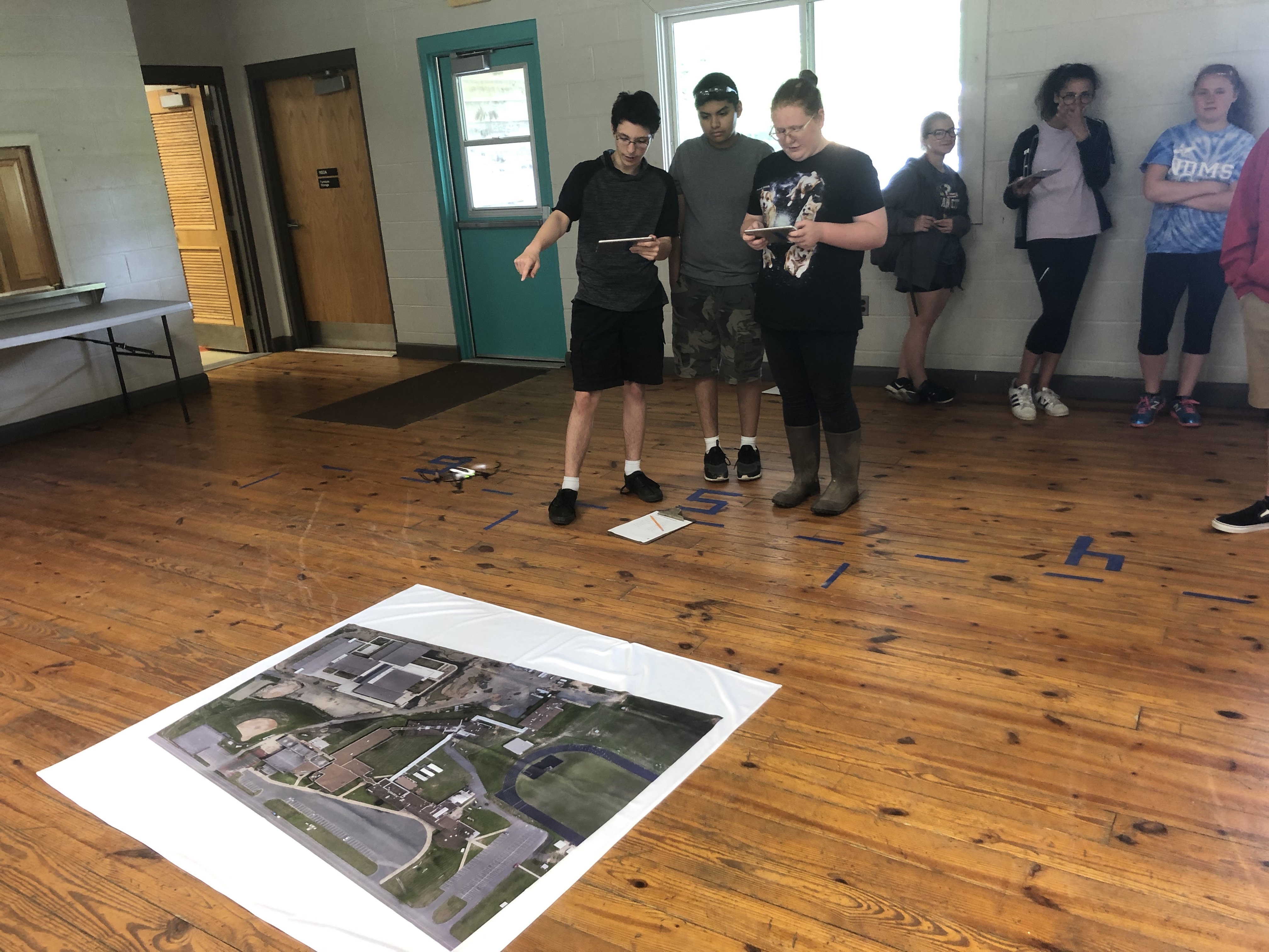 Students also learned about drone safety and FAA flying laws, using a safety checklist that one should always use when flying. Students were taught how to manually fly using flying controls: pitch, roll, throttle, yaw. We practiced drone operations during a fun and challenging game of Drone Simon Says. Students then learned how to code an autonomous flight to capture aerial images over enlarged maps of Cambridge Creek and North Dorchester High School. This information was used to identify physical, biological, and chemical threats to local water quality. This activity provided students a new perspective and technique for identifying key water quality issues which will be implemented in meaningful action projects.