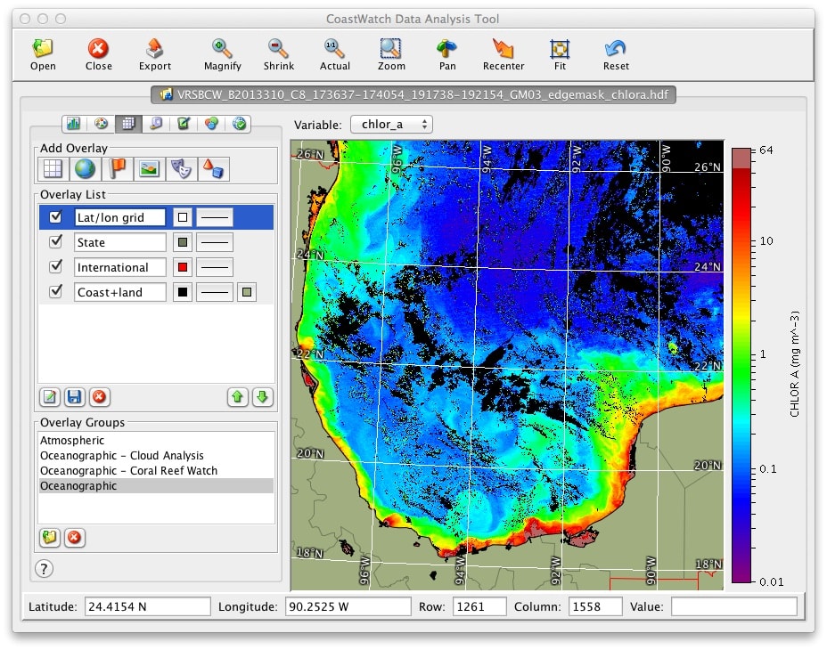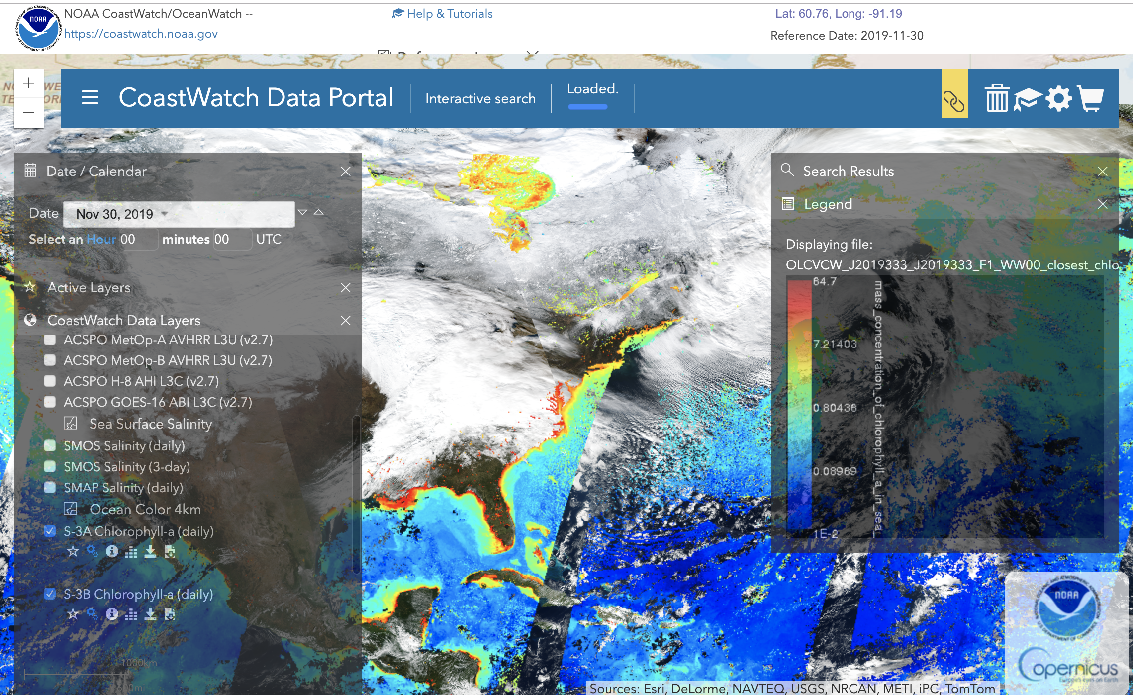 - NOAA CoastWatch: CoastWatch was developed to facilitate the use of ocean satellite data to assess impacts of environmental change. It provides a variety of environmental data (i.e. sea surface temperature, ocean color, winds, etc.) from several satellite platforms covering all U.S. coastal waters. CoastWatch has several interactive data search tools to visualize and download data. CoastWatch also has a downloadable software, CoastWatch Utilities which has more capabilities to manipulate and analyze satellite imagery.