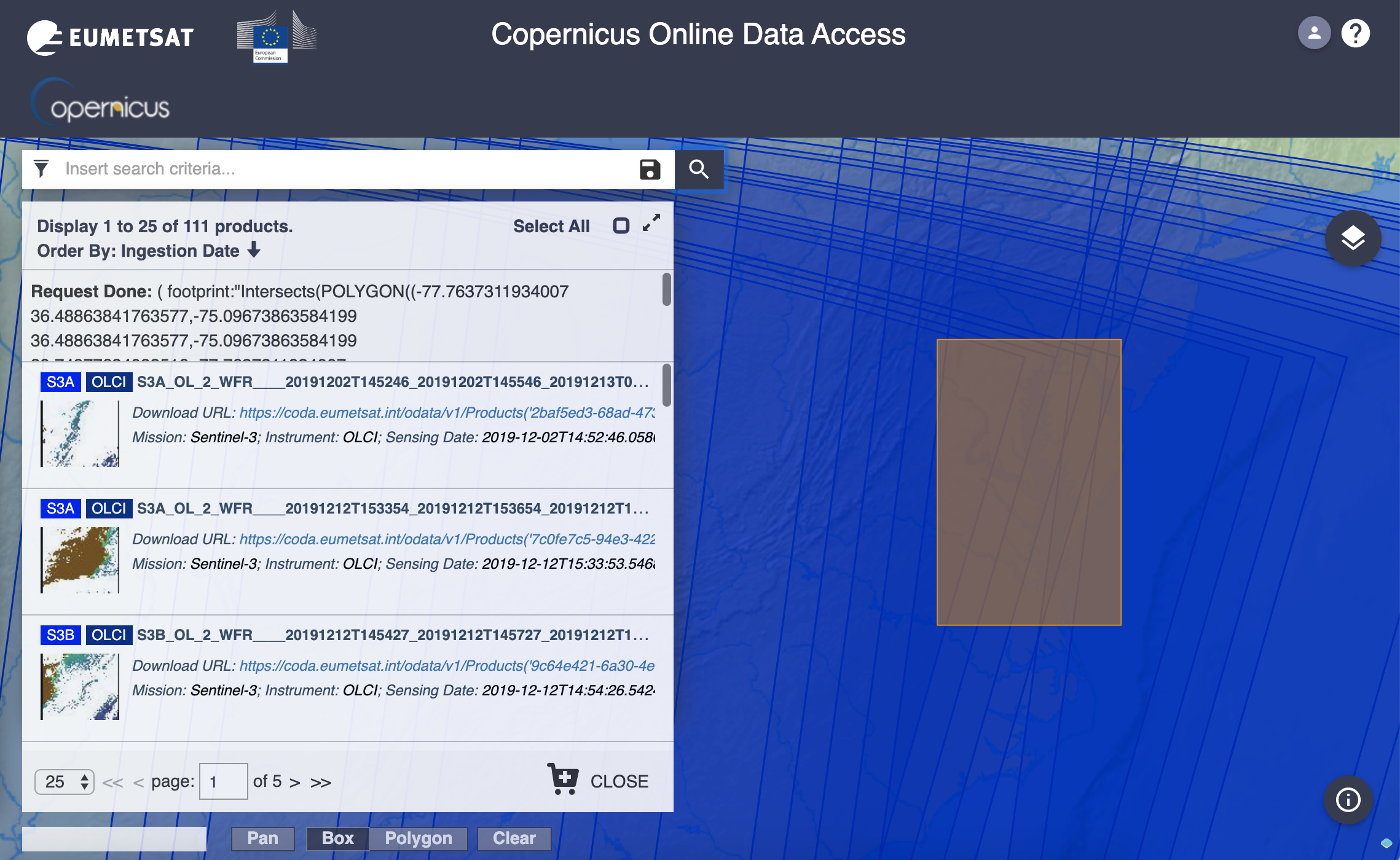 EUMETSAT controls the Copernicus Online Data Access (CODA) which provides free access to Sentinel-3 products through a 12 months rolling archive with access to Level 1 and Level 2 Marine data. Files after 12 months can be downloaded from EUMETSAT’s Data Center which provides a long-term archive of data. When processing algorithms are periodically updated, users can access reprocessed data from the online archive at CODARep.