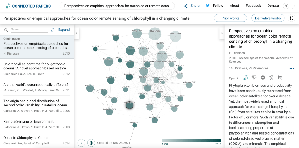 3. Connectedpapers.com. I found out about this website from another graduate student at Horn Point Lab (thanks Hannah!). It’s an awesome and really efficient way to conduct a literature review. On the homepage, you can type in a ‘paper identifier’ which can be a keyword, author, or a title of a paper. I find it easier to type in a title of a paper I have already found and then explore all of the other papers connected to it. An example of a graph can be seen below. Each node is an academic paper related to the origin paper. The size of the node is the number of citations the paper has, the color represents the publishing year with darker colors representing more recent papers. You can click on one of the nodes to pull up further information on the right hand side and then click the title to access and download the paper.