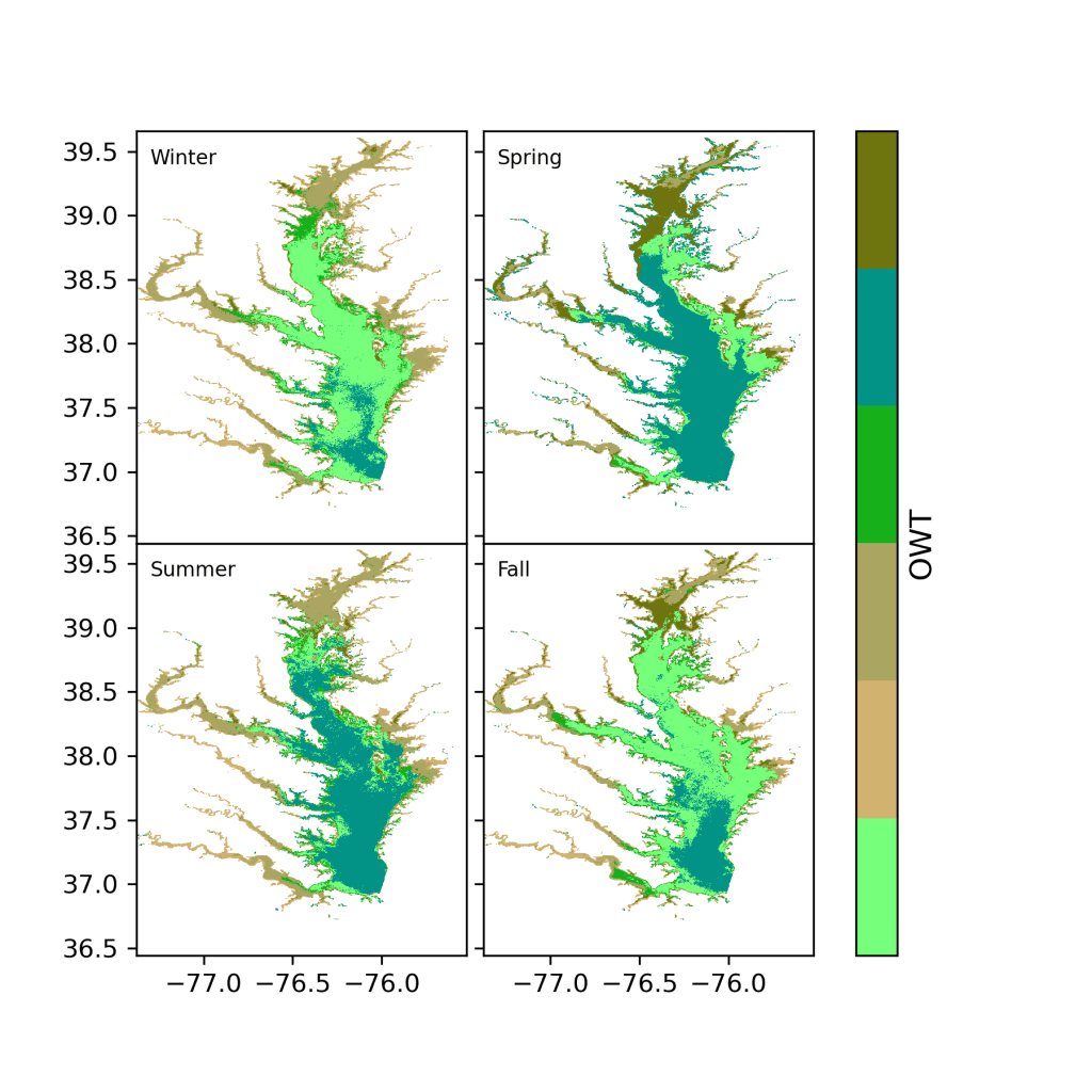 Remote sensing reflectance (Rrs) spectra is the fundamental quantity derived from ocean color satellites and used as input into various bio-optical algorithms to obtain of water quality concentrations such as chlorophyll a. An optical water type classification defines dominant Rrs spectra through space and time and can be used assess marine biological diversity of different water bodies and aid in bio-optical algorithm selection. The objective of this research is to build upon the knowledge of optics in Chesapeake Bay and describe optical water types over time and space. This research will be used to investigate if water quality properties (Chl a, inorganic suspended sediments) are constrained within optical water types. We ran an unsupervised machine learning clustering algorithm (K-means) to 51 million Rrs spectra collected by the Ocean Land and Color instrument onboard the European Commission Copernicus programmes Sentinel 3A and 3B to derive dominant Rrs spectra, or optical water types, of Chesapeake Bay.